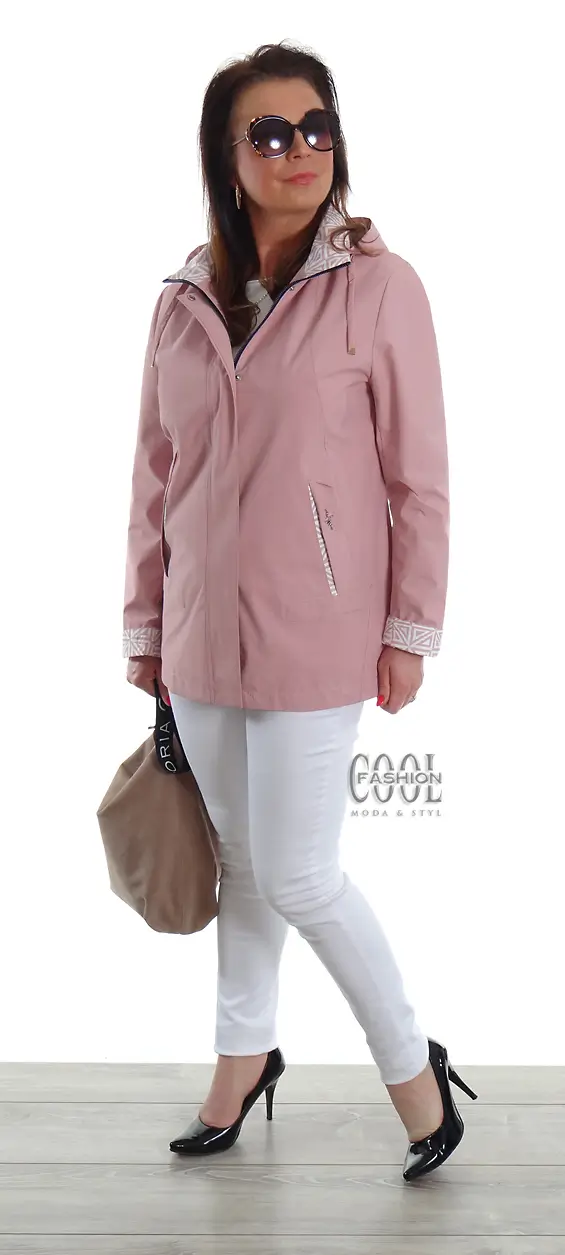 Lehká jarní bunda, podšitá větrovka s odepínací kapucí. Zapíná se na zip a řadu patentek skrytých pod klopou. Klasický styl vyrobený z voděodolného a větruodolného materiálu. Zdobené kontrastními vsadkami a jemnými švy. Dvě praktické kapsy jsou bez zapínání. Na kapuci má stahovací pásky pro tvarování tvaru. Jarní bunda, ultralehká, nezateplená.