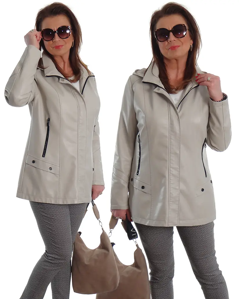 Přechodná bunda s podšívkou, s odnímatelnou kapucí, vyrobená z vysoce kvalitní umělé kůže. Klasický střih a design. Zapíná se na zip a řadu patentek skrytých pod klopou. Bunda má dvě hluboké vnější kapsy na zip. Pečlivě vyrobená se stylovým prošíváním a detaily, je neuvěřitelně pohodlná na nošení. Ideální pro ty, kteří sledují nejnovější módní trendy. Bundy přímo od výrobce s visačkami a v originálním balení.