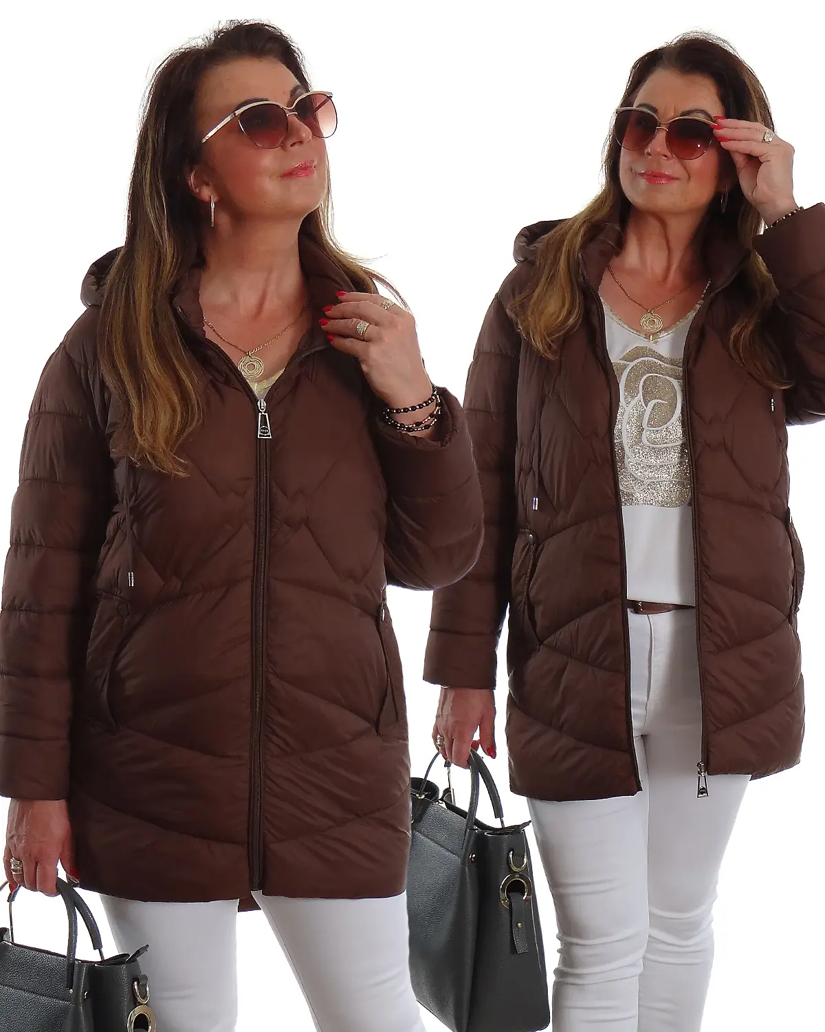 Delší přechodná bunda s odnímatelnou kapucí a prodlouženými zády. Asymetrický střih. Bunda je podšitá a lehce zateplená, takže je vhodná na jarní a podzimní nošení. Má dvě skryté kapsy na patentky. Kapuce má stahovací šňůrky pro přiléhavější střih. Je velmi pohodlná na nošení, ultralehká a praktická.